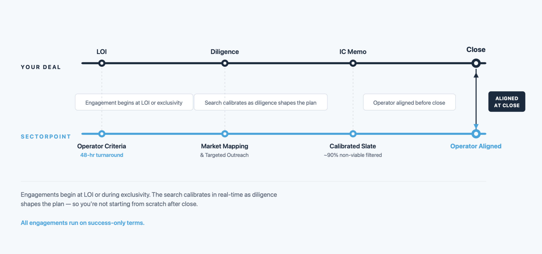 Leadership searches that run alongside diligence so the right operator is aligned before the founder steps back - on success-only terms.